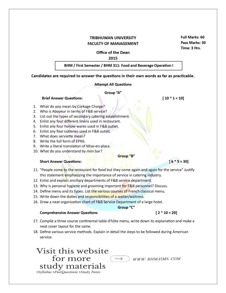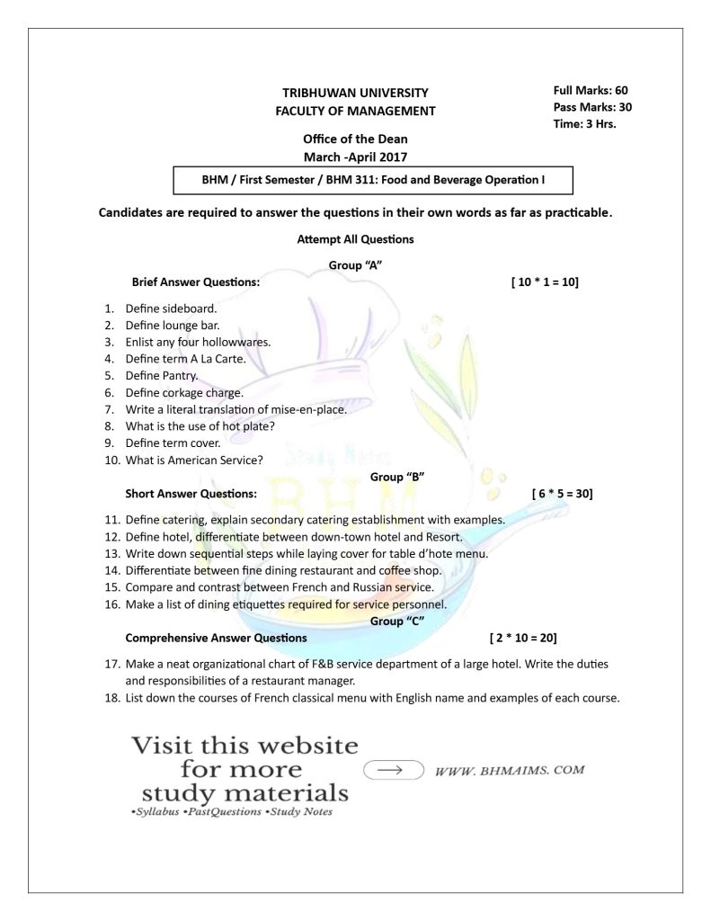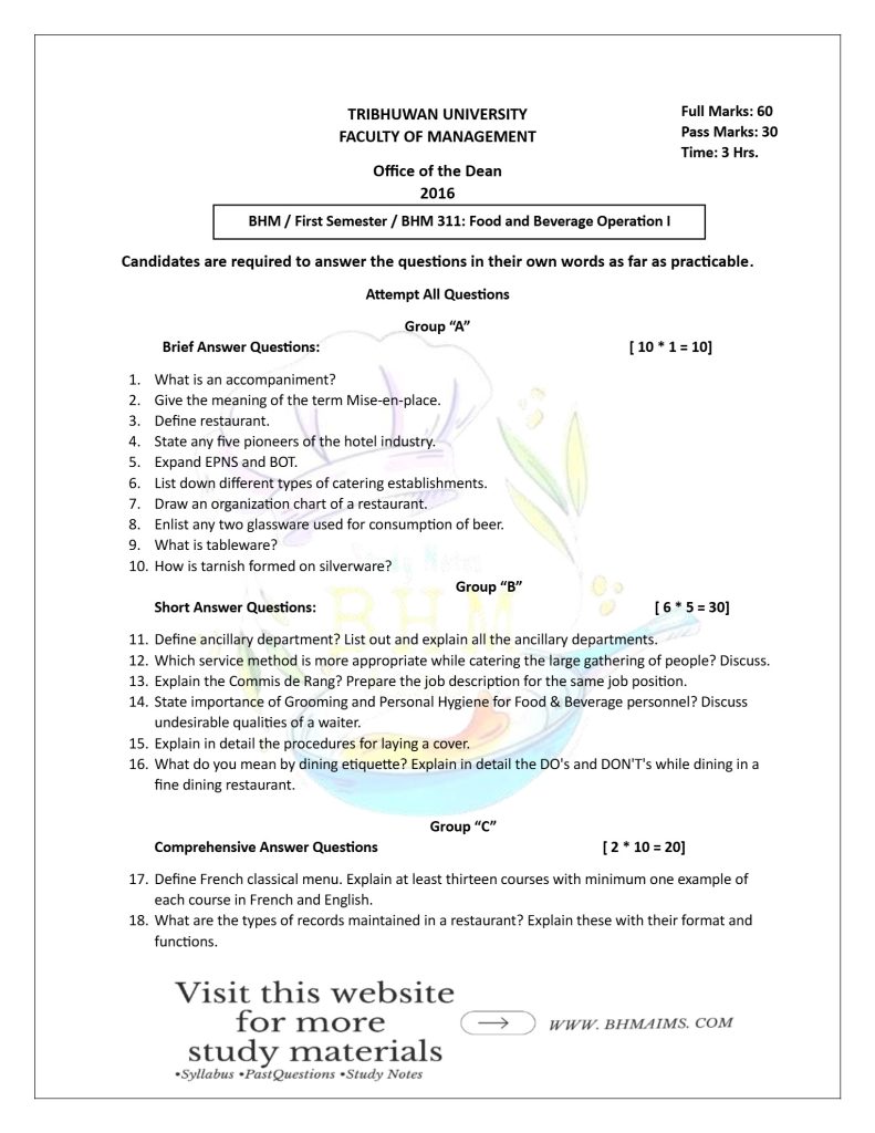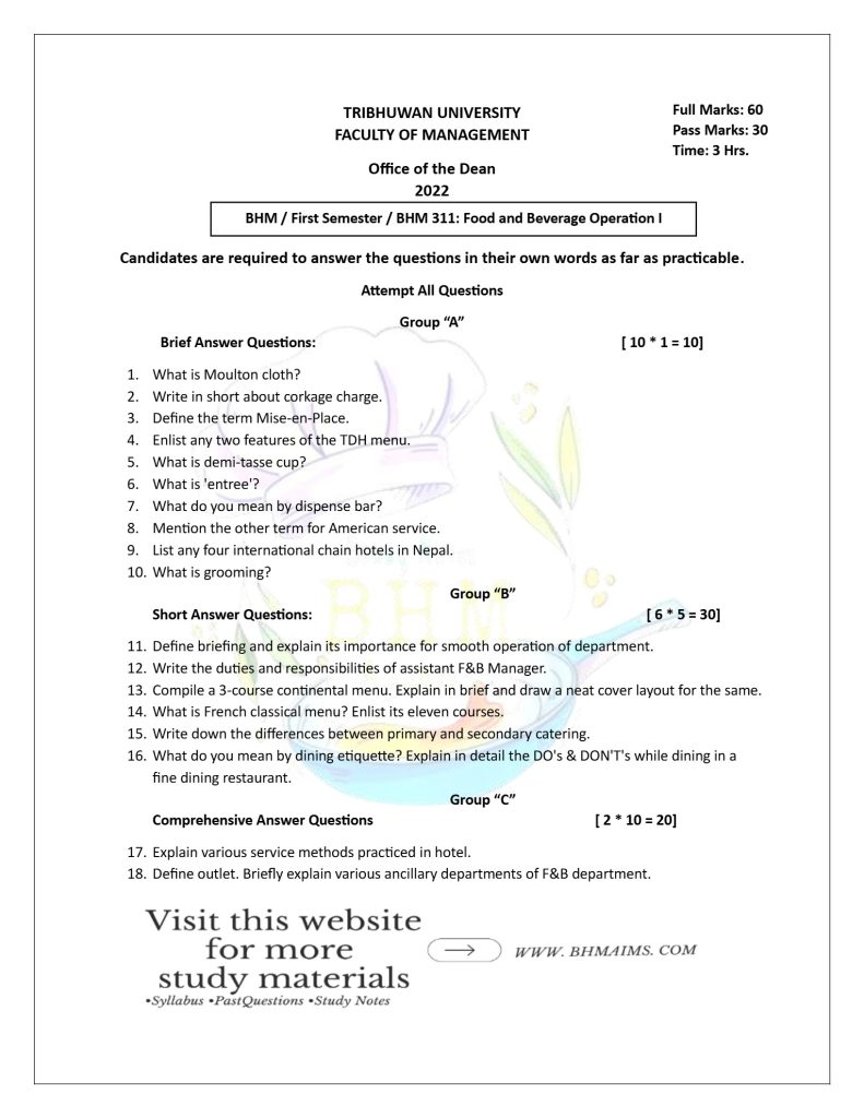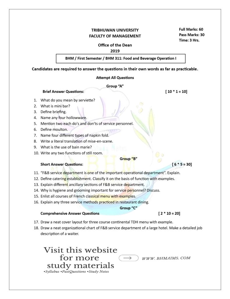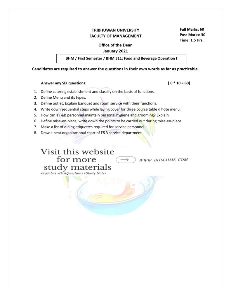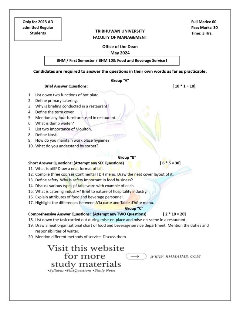 If you’re looking for BHM 1st Semester TU Food and Beverage Service-I questions, you can now use the BHM 1st Semester TU Service past questions for free. Our comprehensive collection of past year questions will help you to practice answering questions and adequately prepare well for your exam.