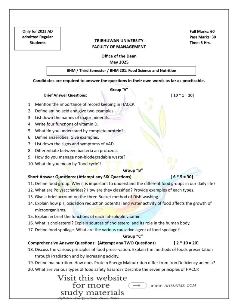 Thank you for visiting our website and exploring our collection of past and old question papers for the Food Science and Nutrition course in Tribhuwan University’s BHM program. At our website, we are dedicated to providing high-quality educational resources to students and educators alike. We are always striving to stay up to date with the latest trends and developments in the hospitality industry and the BHM curriculum. Therefore, we regularly update our collection with fresh questions as soon as they become available. We also offer study notes, syllabus, and past year questions for all semesters and subjects of the BHM program. So, be sure to stay tuned with us for the latest updates.