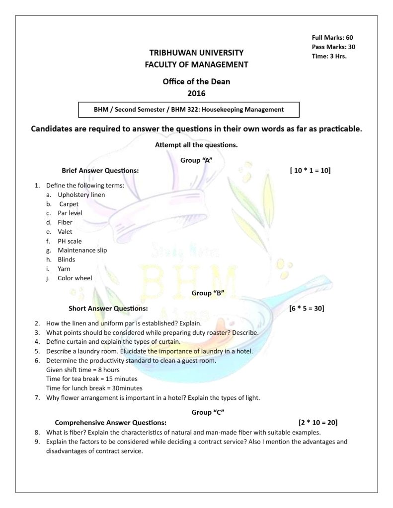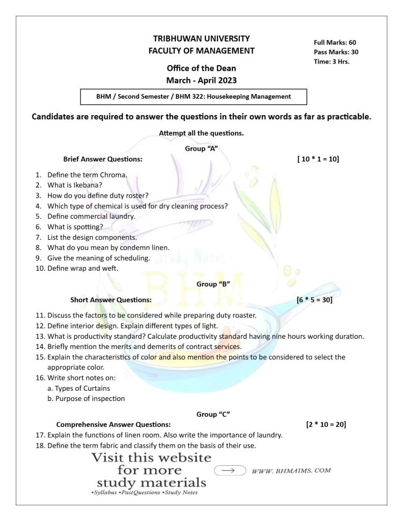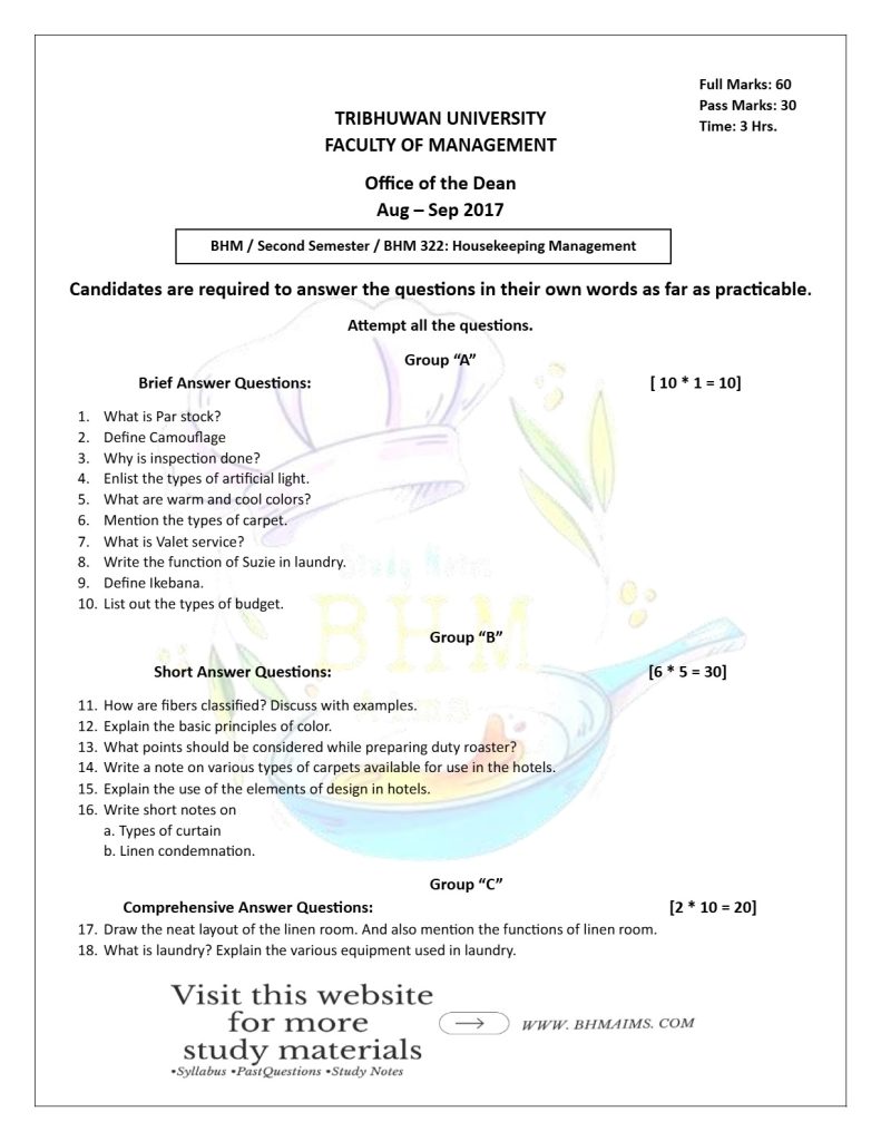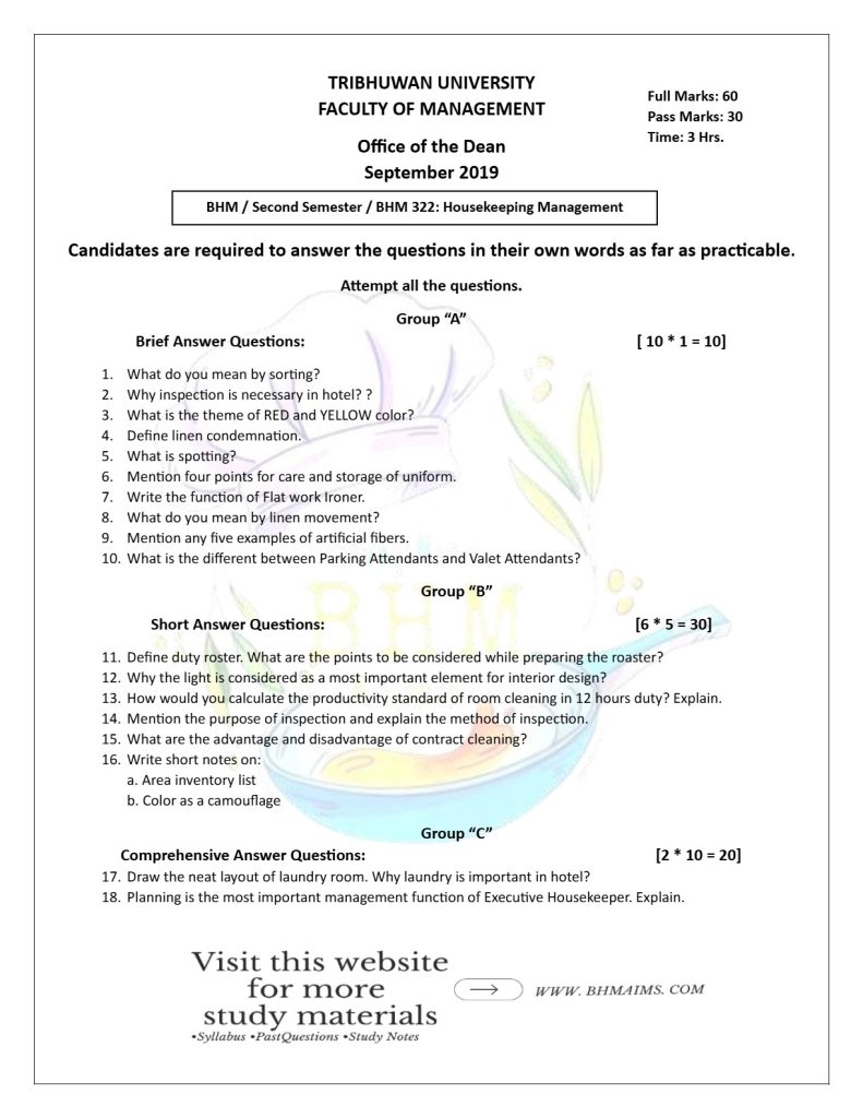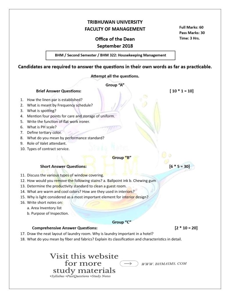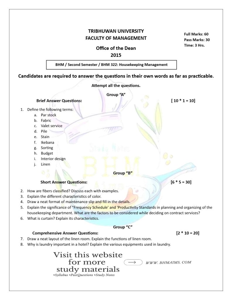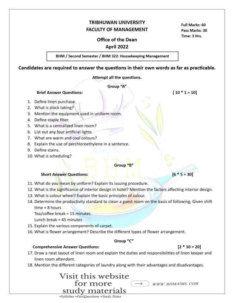 BHM /Second Semester / BHM 322: HouseKeeping Management