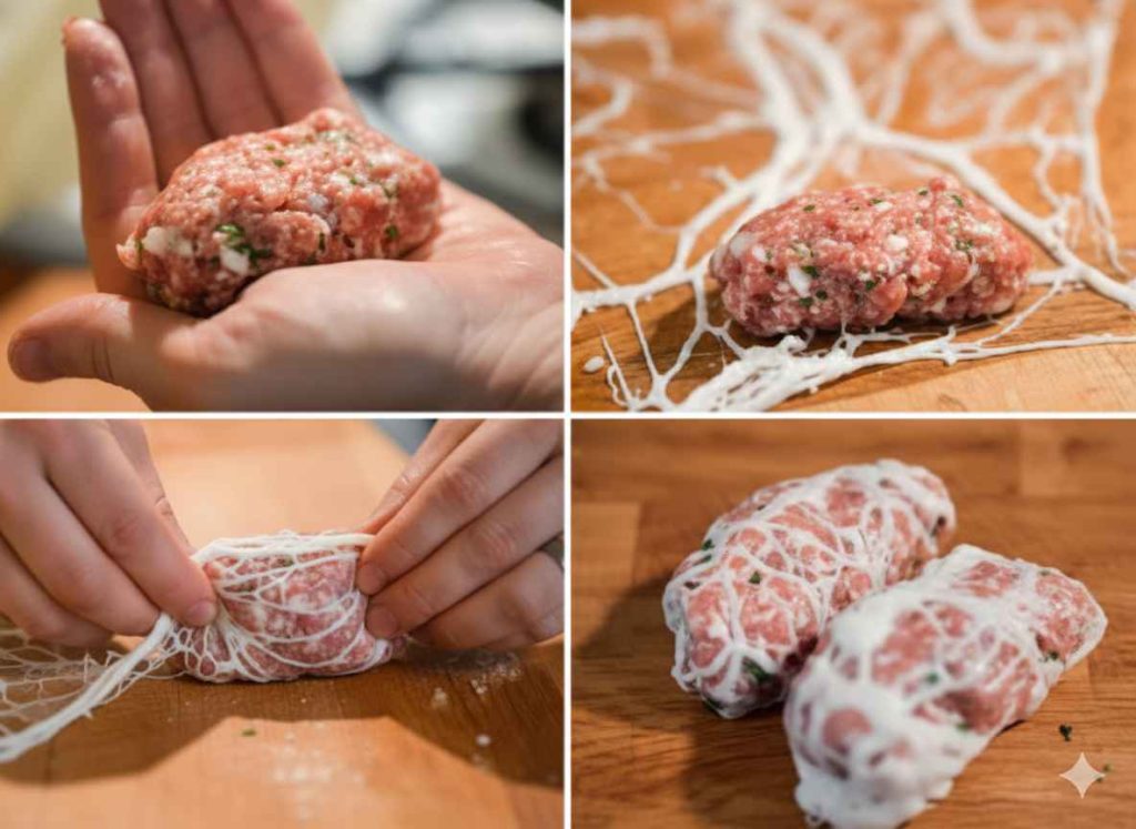 Caul fat is a thin, membrane-like lining of the stomach. It looks like a spider-web with streaks of fat.