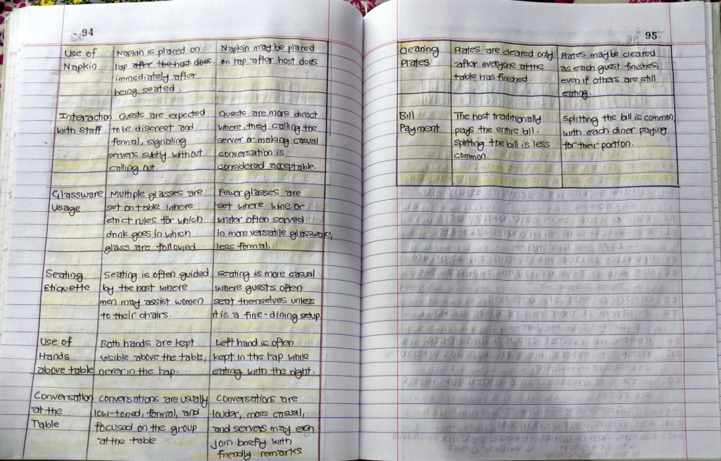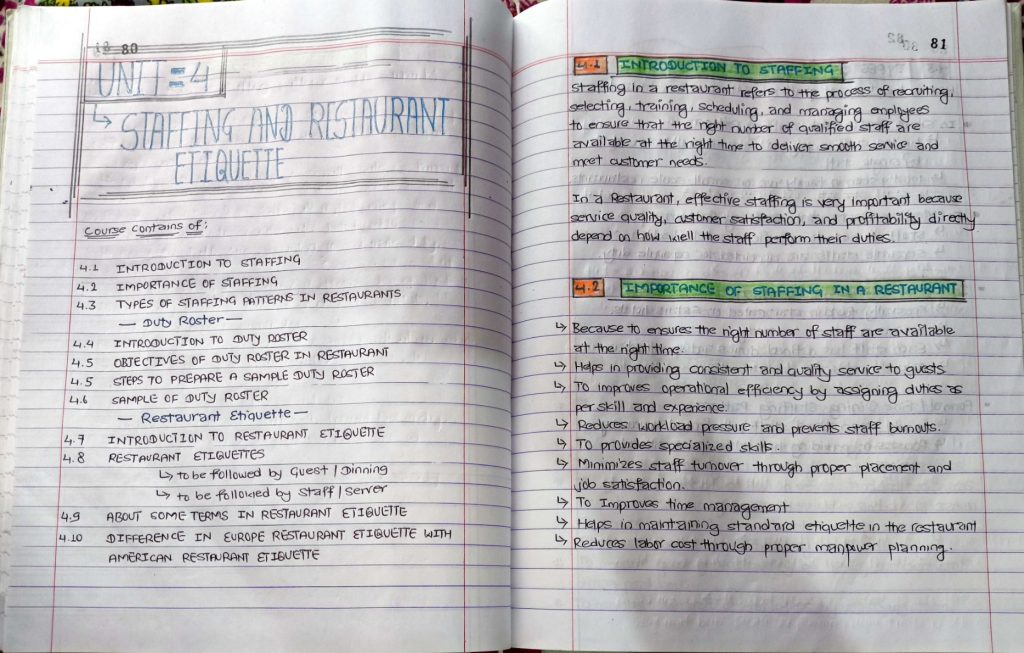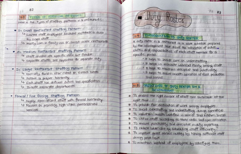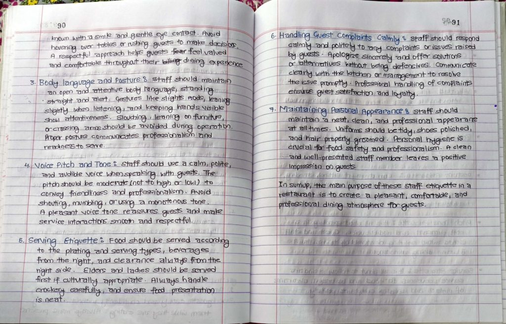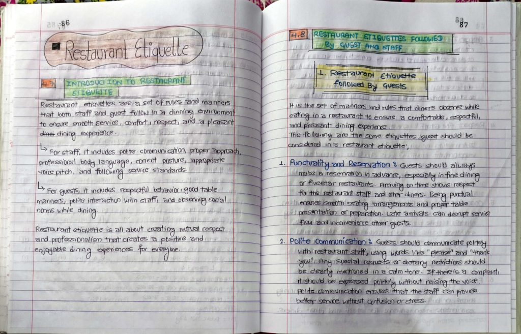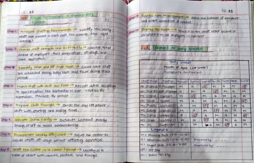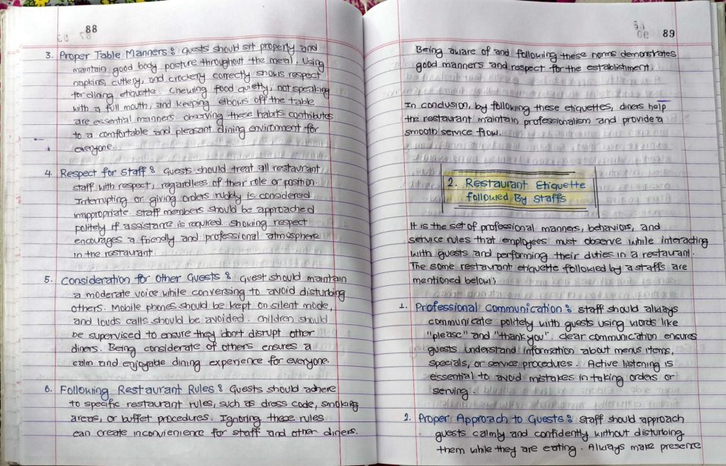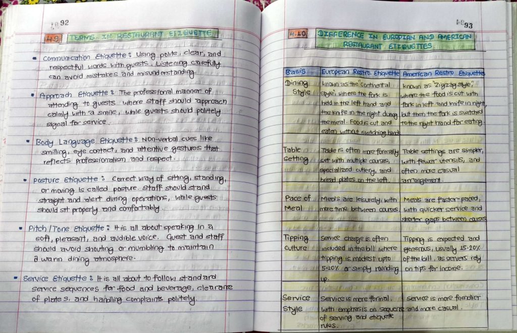 Introduction, Making of a sample duty roster, Restaurant Etiquette (To be followed by the guest and staff the set rules in relation to communication, approach, body language. Posture, pitch and service etiquette. Difference in Europe and America