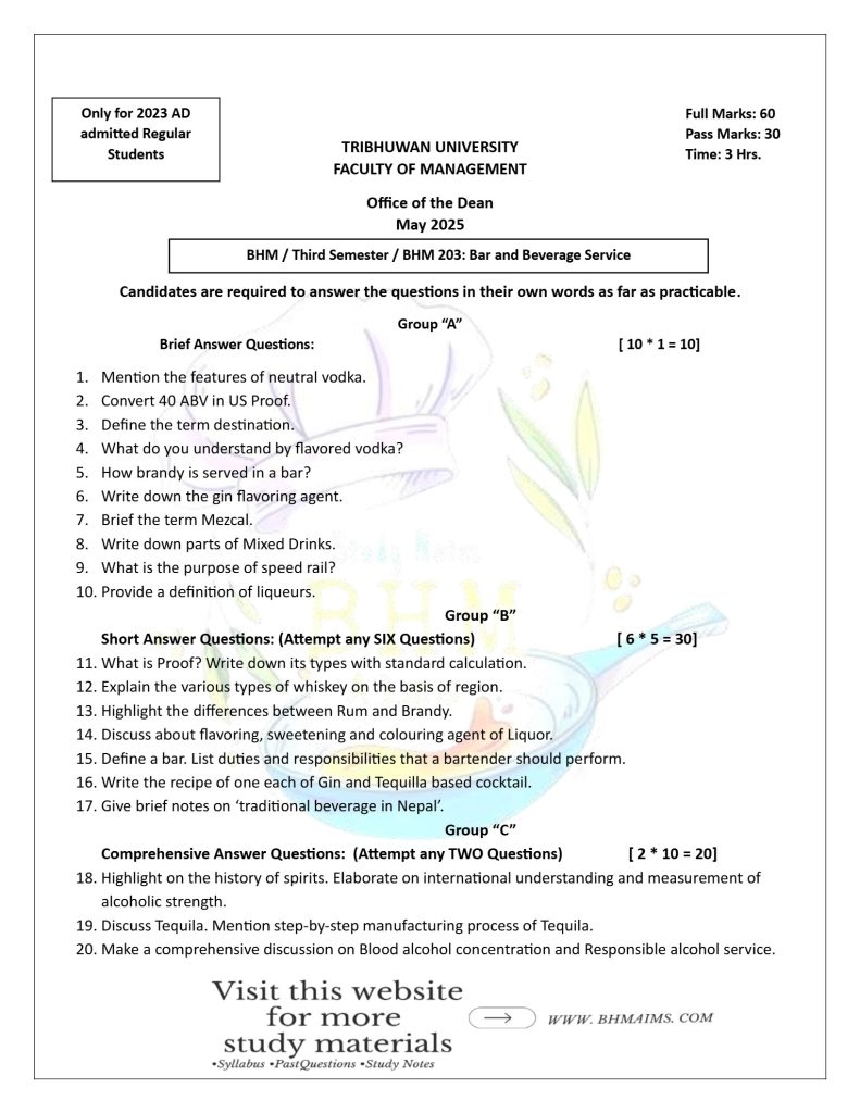 Tribhuwan University BHM 3rd Semester Bar and Beverage Service Question Papers / BHM 3rd semester Past Year Question Paper / By BhmAims