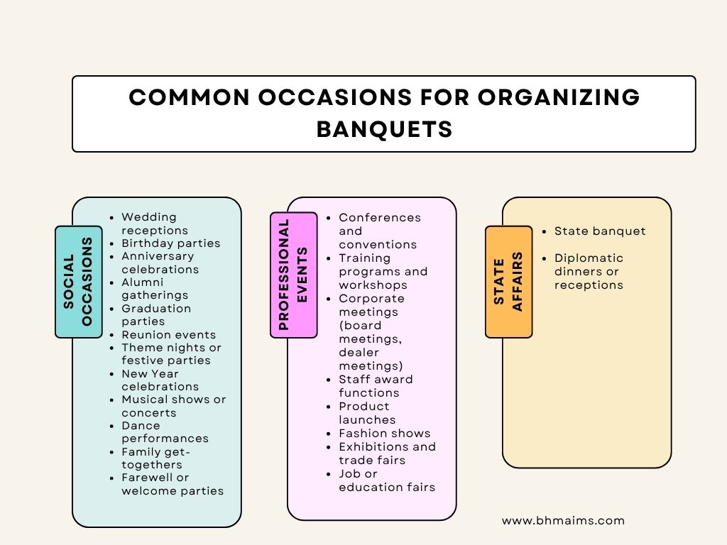 Based on the purpose or nature of the event, Banquets are generally divided into three main categories: