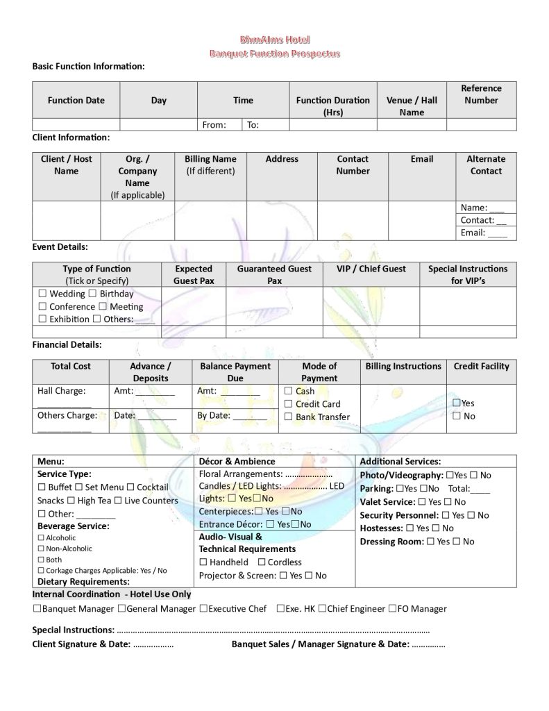 - The Banquet Event Order (BEO) is drafted — a detailed document with: