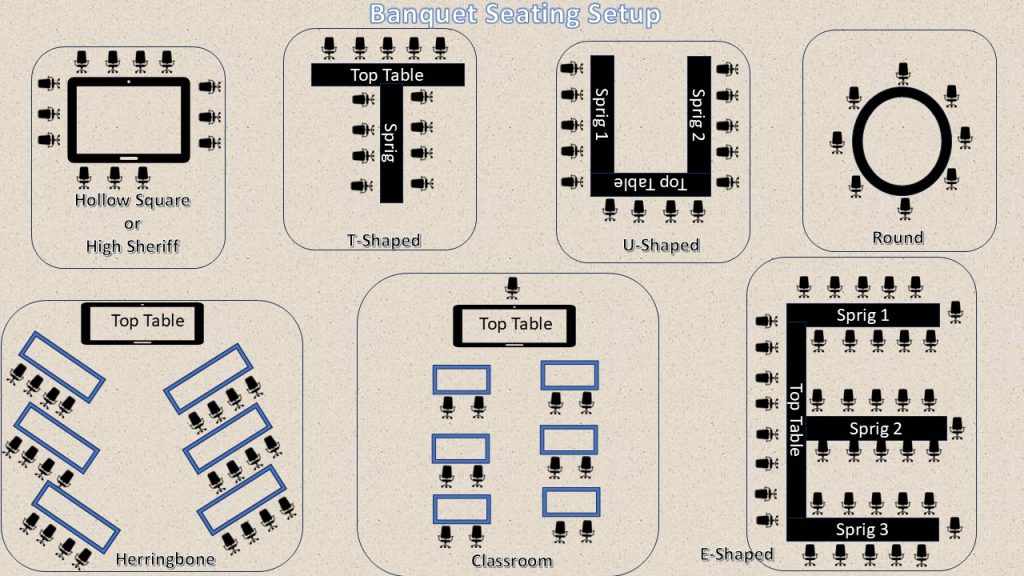 - Top Table with Sprig: It is the arrangement with top table where the host, chief guest, guest of honour, and VIPs are seated and the sprigs where the other invitees are seated. Who will be seated at the top table and sprigs will be decided by the host.